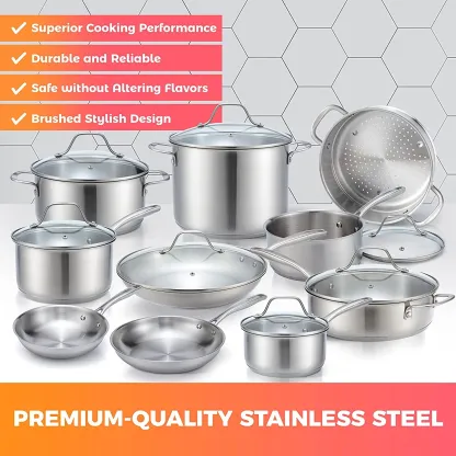 Pots and Pans Set 17-Piece, Stainless Steel Cookware Set, Ergonomic and Stainless Steel Handle, Includes Saucepans, Skillets, Dutch Oven, Stockpot, Steamer and More