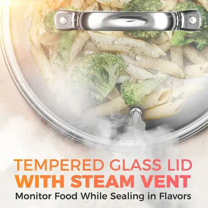 - Seal In Flavors - Utilize the professional-grade tempered glass lids to help retain heat and seal in moisture and nutrients for healthier, more flavorful meals. The covers with steam vents fit perfectly within the smoothly tapered rims, designed to eliminate drips and spills while pouring. Double riveted comfort grip handles provide extra strength and stay cooler for longer to help maneuver on the stove top.