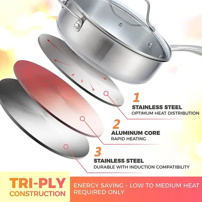 - Strong And Durable -The pots and pans feature a 3-ply premium quality stainless steel base with a thick aluminum core for fast and even heat distribution and maximum durability. The non-toxic stainless steel cookware will not discolor, react with food, or alter flavors, keeping your meals safe and healthy. The even heating reduces hot spots that can easily burn foods and cooks foods faster to save you both time and energy!