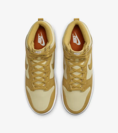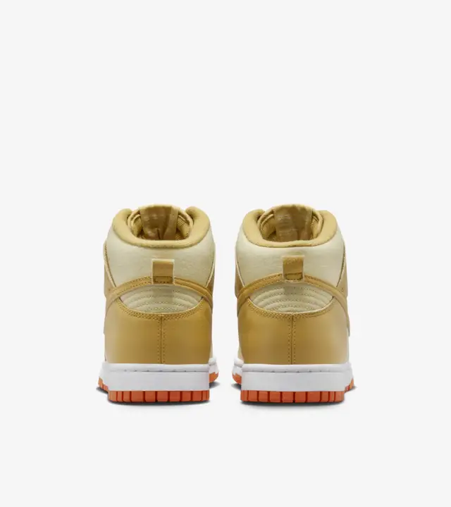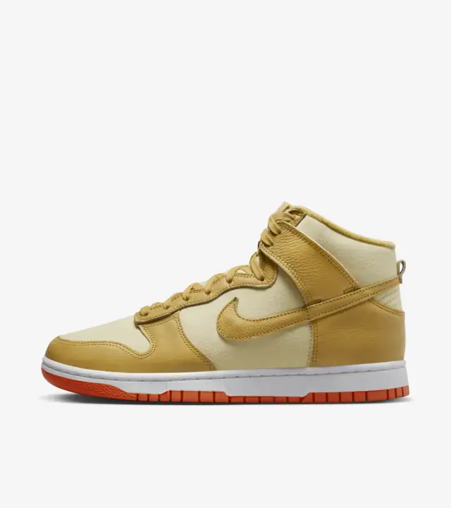 More iconic than amber waves of grain, this Dunk High redefines timeless. Canvas underlays with natural variation nod to classic workwear, while textured leather overlays in warm Wheat Gold add polish to your look. A punctuation of Safety Orange underfoot energizes the earthy upper��and that plush high-top collar? It brings sofa-night softness anywhere you go. They're essential for a reason.